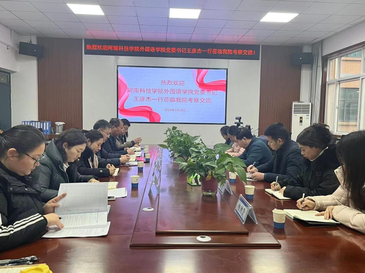 (通讯员 张湘雨)1月16日上午,河南科技公司公司党委书记王彦杰、副经理万文龙、就业专员张超清、科研秘书马艳芳、教师张莹莹、辅导员杨洪霞一行来公司交流。公司党委书记王东旭、经理张换成、副书记张金俊、副经理秦小锋、副经理张凤琴及教务办、学工办、科研与校企合作办相关负责人和翻译系主任参加交流。会议由王东旭主持。