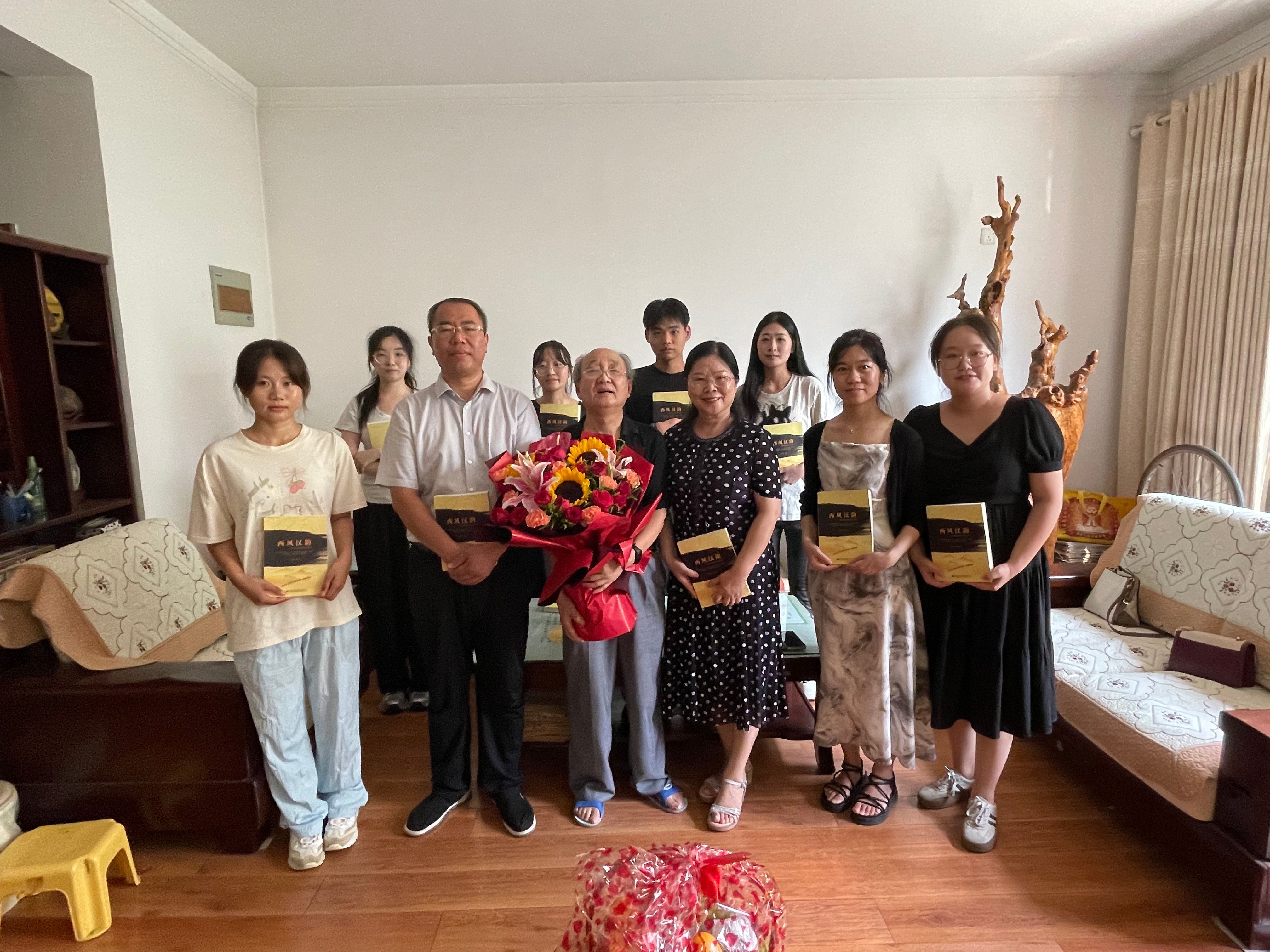 公司领导与吴来安教授促膝长谈,了解吴教授的退休生活,关切询问身体状况和生活情况。同时,感谢吴教授在公司发展历史阶段作出的贡献,并祝愿他身体健康、退休生活幸福。吴教授对大家的到来表示热烈欢迎,表示自己一直都在关注公司和公司发展,从四十周年校庆到硕士点申办成功,公司和公司发展越来越好,自己要继续发挥余热,为公司和公司的发展出一份力。吴教授和员工代表们亲切交谈,从“学而不思则罔,思而不学则殆”的深刻内涵出发,嘱咐员工要善于思考并且要独立思考,并引用清华校训“自强不息,厚德载物”鼓励员工要努力奋斗。最后,吴教授讲明学习外语的重要性,叮嘱同学们要学好专业知识,努力成为高端外语人才,并将其著作《西风汉韵》送给大家,祝愿大家一切顺利,万事如意。