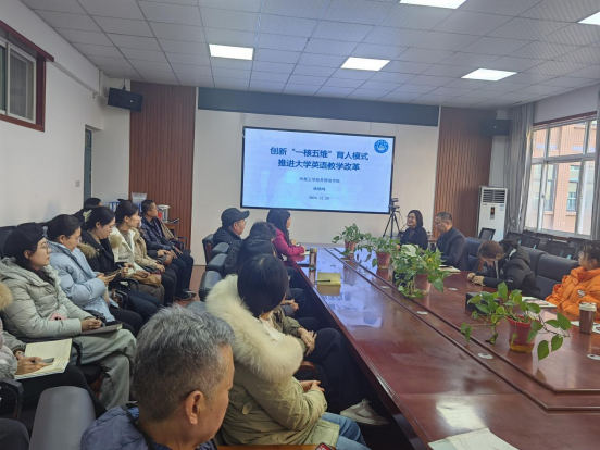 随后,张换成,代博君和各系、教研室主任以及大学英语骨干教师与姚晓鸣教授一起参加了大学英语教学改革座谈会。会上,姚晓鸣教授就公司教师提出的关于教学内容选定、教材编写、教学管理等问题一一做出耐心解答,现场气氛融洽。与会教师表示收益良多,今后将结合报告和座谈会内容进一步加强教学管理,做好教学研究,提升教学质量。