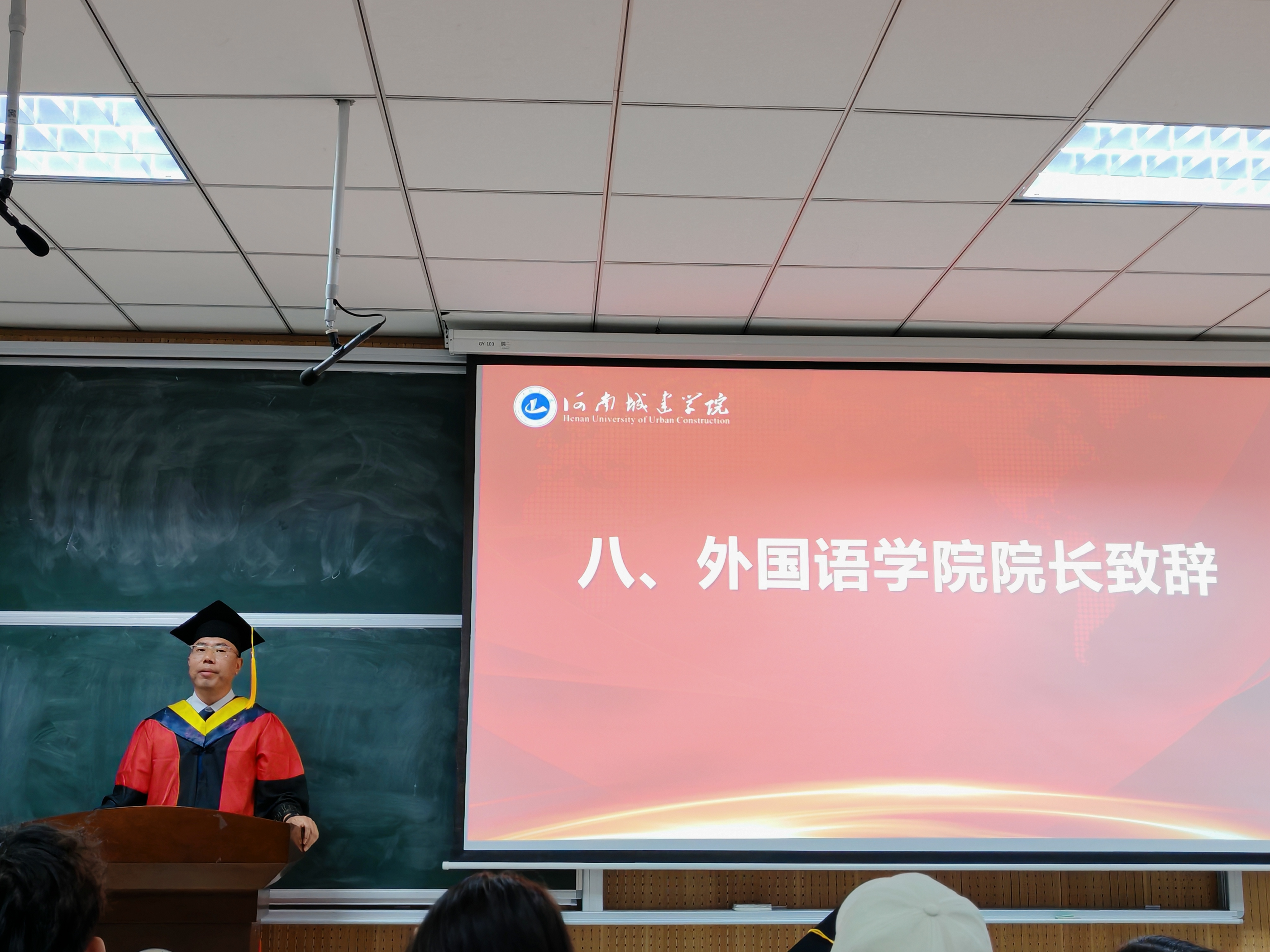 经理张换成致辞,他代表公司向2025届毕业生顺利完成学业表示最诚挚的祝贺,感谢2025届毕业生与全院师生一起凝心聚力、守望相助、迎难而上,回顾了这届员工参与的跨文化交际大赛、外语文化节、“三下乡”社会实践等精彩纷呈的各类活动,嘱托他们:始终保持终身学习的热情,遇到困难时,不气馁;取得成绩时,不骄傲;始终心怀家国,用所学知识讲好中国故事,传播中国声音,展现新时代外语人的使命与担当。