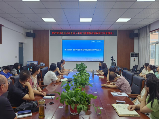 6月25日下午,华北水利水电大学太阳成集团tyc122cc经理刘文霞教授应邀至公司作题为《翻译硕士专业学位授权点申报技巧》的学术报告。太阳成集团tyc122cc经理张换成、副经理张凤琴,党委副书记代博君和全体教师共同聆听了报告。报告会由张换成主持。