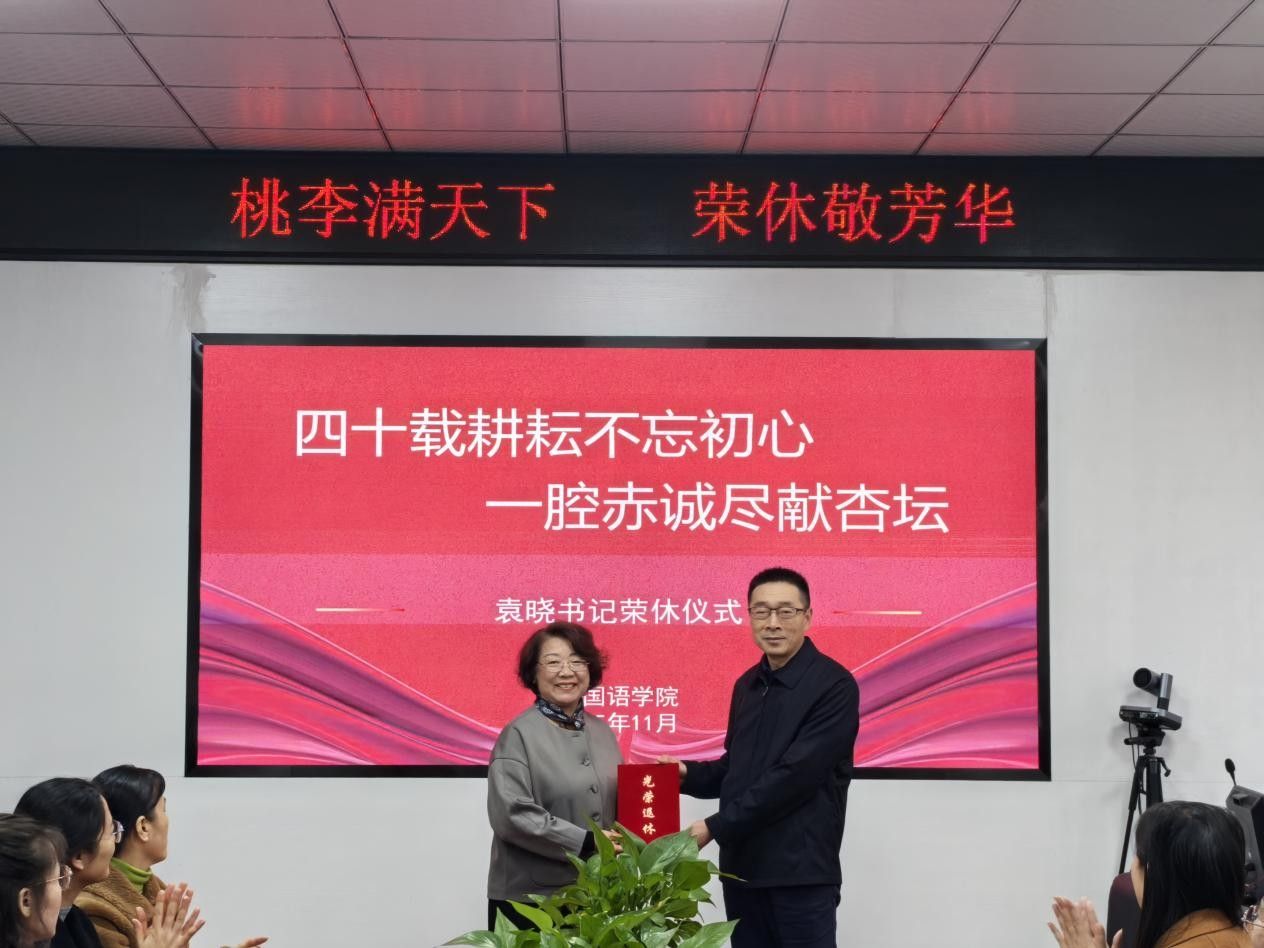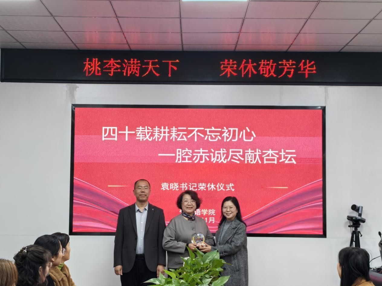 仪式伊始,王许涛宣读了公司关于袁晓同志退休的决定。随后,会议简要回顾了她的教育生涯。袁晓同志从教四十载,职业生涯深深扎根于太阳成集团tyc122cc,曾担任团学办主任、外语系实验中心主任、外语系副主任、公司党总支副书记、党总支书记等职务。无论在哪个岗位,她始终秉持高标准、严要求,是公司教学科研稳步提升的推动者,也是党建工作扎实开展的领路人。