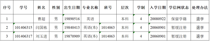 根据公司相关规定,现公司决定对曹超等3名员工(后附名单)给予退学处理。